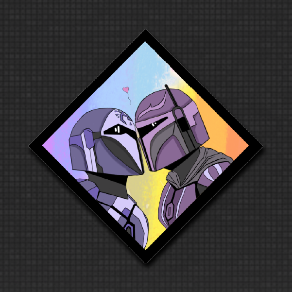 A four inch diamond patch featuring two mandos preforming the Keldabe Kiss on a sublimated pale rainbow background.